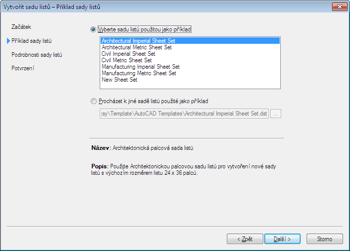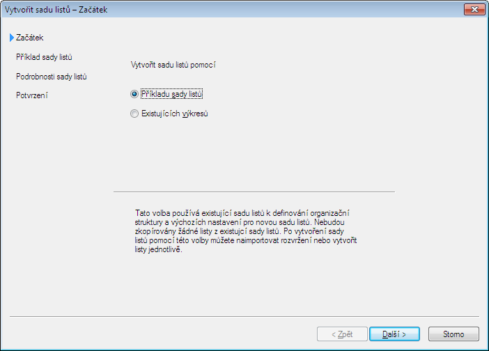 | použít příklad sady listů ze seznamu | klikněte na možnost Použít sadu listů použitou jako příklad, vyberte sadu listů ze seznamu a potom klikněte na tlačítko Další. |