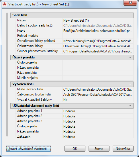 | Název, Číslo, Fáze, Milník v rámci Řízení projektu | Pokud pracujete v projektu aplikace Sada nástrojů AutoCAD Architecture 2027, informace o projektu jsou spojené se souborem projektu (APJ) místo sady listů projektu. Poznámka: Pokud v dialogu Vlastnosti sad listů v rámci Řízení projektu zadáte název projektu a číslo projektu, které se liší od názvu a čísla projektu zadaných při vytváření projektu, zobrazí se při úpravách projektu chybová zpráva a budete vyzváni ke sjednocení informací. Proto se důrazně doporučuje nechat pole Řízení projektu v šabloně listu projektu prázdná.