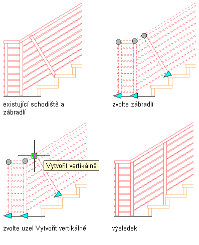 Po určení vertikální orientace stojky zábradlí se uzel Udělat svisle změní na uzel Udělat kolmo. Výběrem uzlu Udělat kolmo obnovte kolmou orientaci stojky.