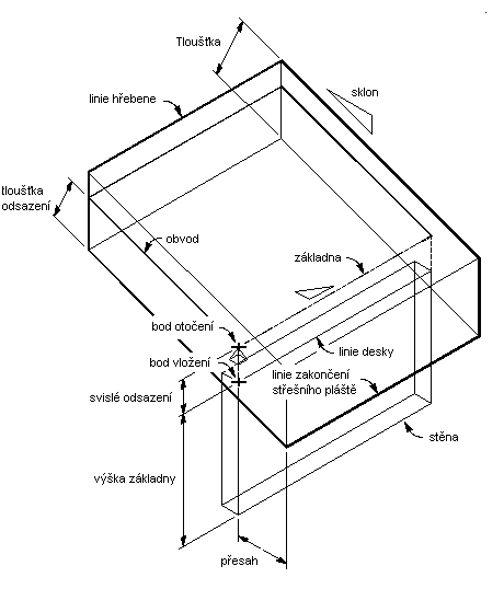 Střešní deska modeluje jednotlivou plochu střechy. Objekty střešní desky se také liší od objektů střechy v tom, že každá střešní deska představuje samostatnou entitu bez přímého připojení na další entity. Při použití více střešních desek k modelování celé plochy střechy, máte více volnosti při úpravách střechy, ale kombinovaná topologie (3D geometrie) střechy není vypočtena automaticky. Z tohoto důvodu se doporučuje, abyste při projektování složitých střech použili nejprve objekt střechy. Jakmile je potom návrh v podstatě kompletní, ale potřebujete více flexibility pro přizpůsobení hran a dalších podrobností, můžete převést střechu na samostatné střešní desky.