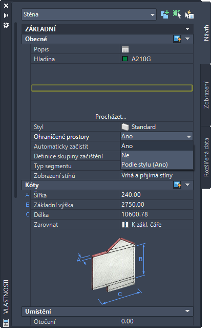 - Na paletě vlastností zobrazte nastavení vlastnosti Ohraničené prostory v některém z následujících umístění: