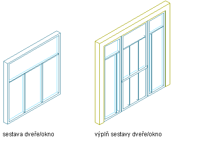 Sestavy oken slouží k podobnému účelu jako jednotky obvodových plášťů, nemohou ale obsahovat tabulové výplně nebo objekty, jako dveře nebo okna. Sestavy dveře/okno lze vložit do obvodových plášťů a standardních stěn.