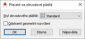 Tento postup použijte, chcete-li vytvořit obvodové pláště, založené na plochách existujících objemových prvků, objemových skupin anebo entit aplikace AutoCAD, jako je síť, přímková plocha anebo těleso. Toto může být užitečné poté, co jste vytvořili model stavby. Pro každou plochu je vytvořen oddělený obvodový plášť. Během procesu převodu jste požádáni o výběr stylu obvodového pláště určujícího počet a velikost buněk v osnově obvodového pláště, stejně jako vzhled buněk, rámu a příčlí.