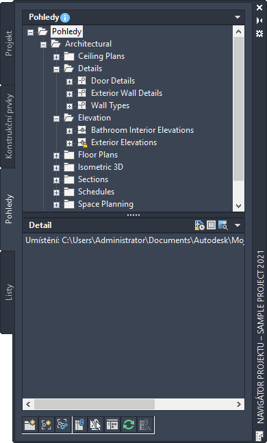 Karta Pohledy na paletě Navigátoru projektu je místem, kde se vytvářejí jednotlivé pohledy vašich stavebních dat. Pohledy obsahují konstrukční prvky a jsou hlavním místem pro přidávání poznámek, štítků a kót v projektu. Po vytvoření výkresu pohledu v něm můžete vytvářet pohledy modelového prostoru.
