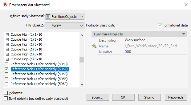 | nechat objekt ve výkresu zvýraznit, když vyberete sadu vlastností, která je připojena k objektu nebo k jeho stylu | vyberte možnost Zvýraznit. |