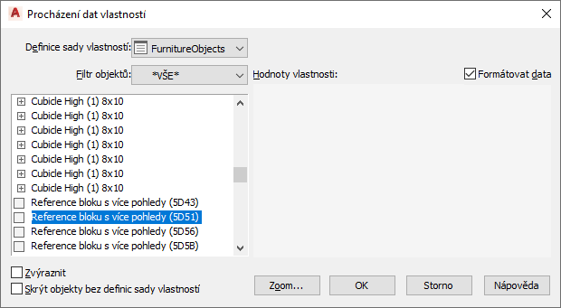 Použijte tento postup k zobrazení a prohlížení dat pro všechny sady vlastností ve výkresu.