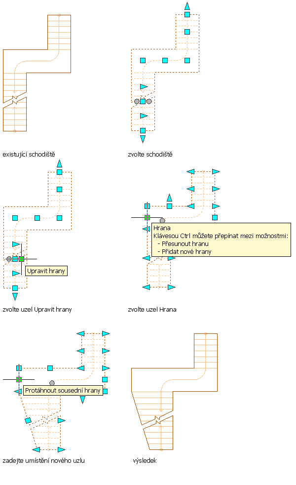 Posunutí jednoho stupně do podesty pomocí jeho uzlu prodlouží podestu v druhém směru. Tažení jednoho stupně ven z podesty neovlivní druhý konec podesty. Schodiště se prodlouží ve své horní části, aby se přizpůsobilo větší podestě. Délku můžete upravit pomocí horního a dolního uzlu na konci výstupní čáry schodiště.