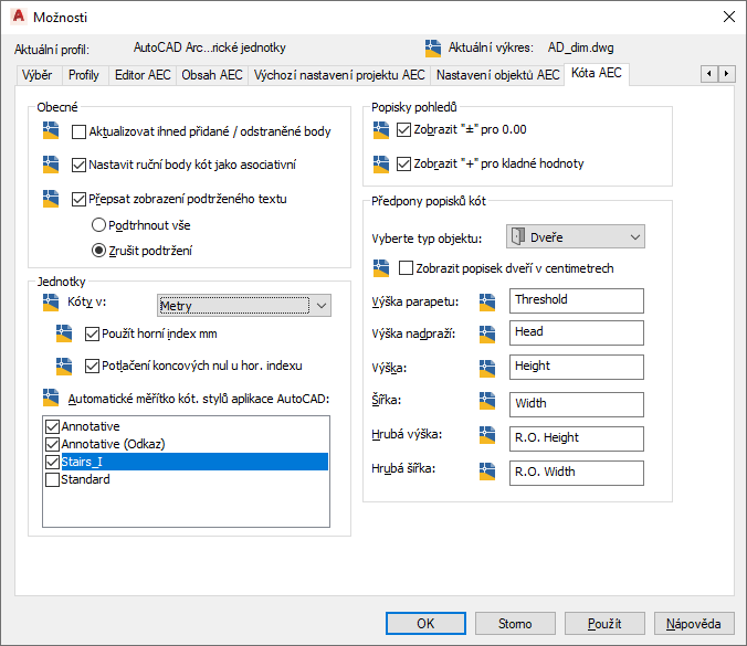 Příklad: Změníte jednotky výkresu z metrů na milimetry. V kótovacím stylu aplikace AutoCAD se změní měřítko následujících nastavení: