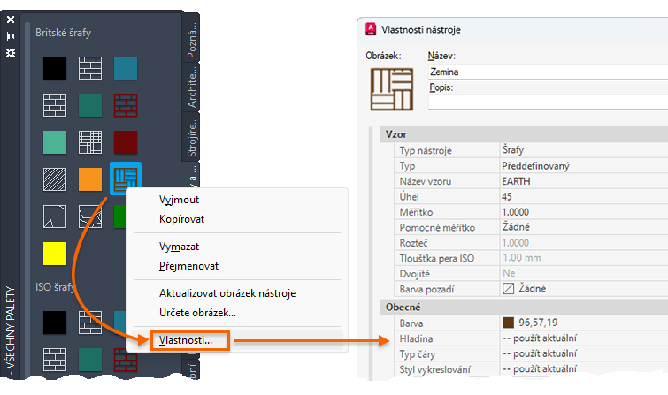 Jakmile je nástroj přidán na paletu nástrojů, můžete změnit jeho výchozí vlastnosti. Můžete například změnit měřítko vložení bloku nebo hladinu šrafovacího vzoru.