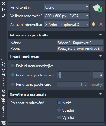 Poznámka: Změnou nastavení standardní předvolby rendrování dojde k vytvoření nové uživatelské předvolby rendrování.