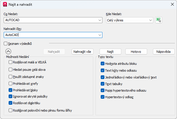 Nastavení Kde hledat určuje, zda se má najít a nahradit text v celém výkresu nebo text v aktuálně vybraném objektu či aktuálně vybraných objektech.