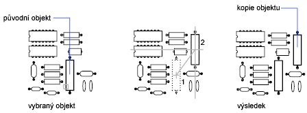 Zkopírujte objekt pomocí vzdálenosti a směru určených základním bodem následovaným dalším bodem. V tomto příkladu kopírujete blok reprezentující elektronický komponent. Vyberte původní objekt, který se má kopírovat. Určete referenční bod pro posun (1) následovaný druhým bodem (2). Objekt je posunut o vzdálenost ve směru bodu 1 k bodu 2.