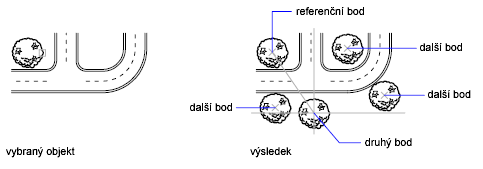 Pomocí možnosti KOPIE můžete vytvořit více kopií ze sady výběru a základního bodu. Možnosti zahrnují následující: