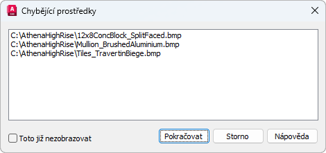 Tento dialog se zobrazí při rendrování scény s mapami textur, jejichž cesta již neplatí. K tomu může dojít, pokud byly mapy textur přesunuty nebo odstraněny nebo pokud byl soubor výkresu přesunut do počítače s odlišným mapováním disků.