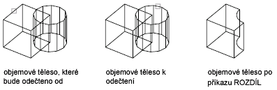 Pomocí příkazu ROZDÍL lze vytvářet 3D tělesa odečtením jedné množiny existujících 3D těles od jiné, překrývající se množiny. 2D objekt oblasti lze vytvořit odečtením jedné množiny existujících objektů oblasti od jiné, překrývající se množiny.