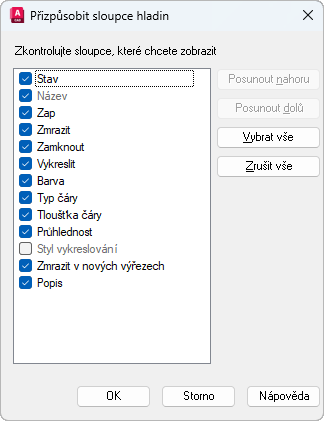 Určuje, které sloupce budou zobrazeny ve Správci vlastností hladiny pro aktuální kartu Model nebo kartu rozvržení.