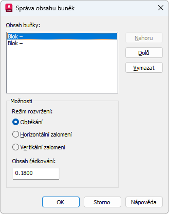 Obsahuje veškerý text, popř. bloky ve zvolené buňce v pořadí, v jakém se zobrazují. Text je označen popiskem Text buňky tabulky. Bloky jsou označeny nápisem Blok před vlastním názvem bloku.