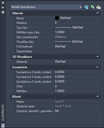 Model koordinace se při změně nastavení na paletě Vlastnosti aktualizuje v reálném čase.