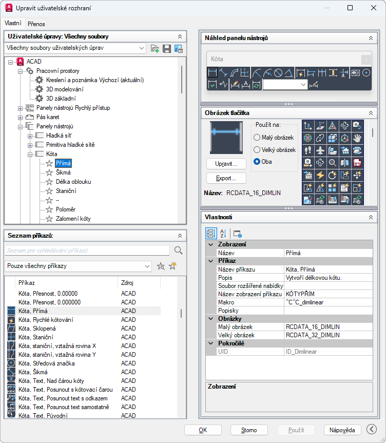 Malý obrázek –·Určuje, že při přidání příkazu do panelu nástrojů, nabídky nebo panelu pásu karet bude použit malý obrázek.