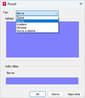 POHLED (příkaz) Hledat: Pohledy > Pohledy modelu > Vyberte pojmenovaný pohled > Obecné vlastnosti: Pozadí > Upravit