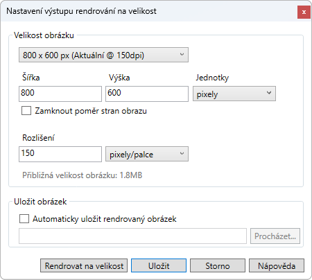 Nastaví velikost výstupu a rozlišení rendrovaného obrázku.