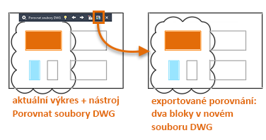 V případě další potřeby je možné výsledky porovnání exportovat do nového výkresu snímku. Výkres snímku si udrží vizuální vzhled porovnání a je pojmenován pomocí kombinace názvů výkresů.