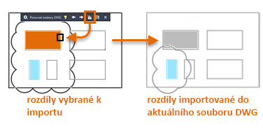 Z panelu nástrojů Porovnat soubory DWG je možné importovat rozdíly z porovnávaného výkresu do aktuálního výkresu. Do aktuálního výkresu je možné importovat pouze objekty, které se liší ve výkresu porovnání.