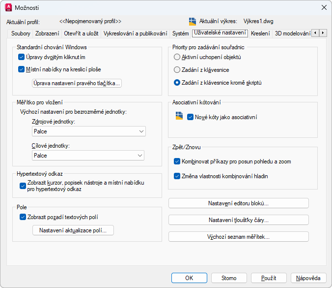 Namísto specifických vámi zadaných souřadnic vždy použije uchopování objektů. (systémová proměnná OSNAPCOORD = 0)