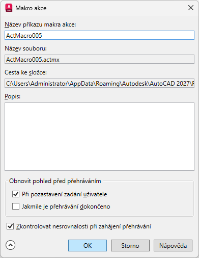 K dispozici je možnost uložit nebo přejmenovat aktuální makro akce a definovat chování při přehrávání. Zobrazení tohoto dialogu lze vypnout zrušením zaškrtnutí možnosti Vyzvat k zadání názvu makra akce v dialogu Nastavení Záznamníku akcí.