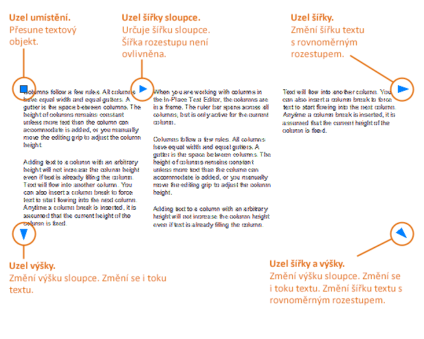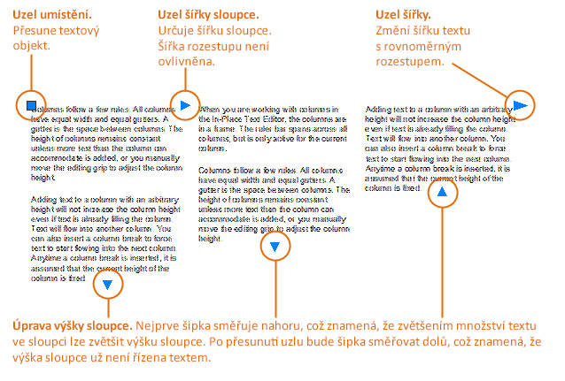 - Přesuňte kurzor na okraj textového rámečku (pravý, dolní nebo roh) a upravte výšku a šířku sloupce.