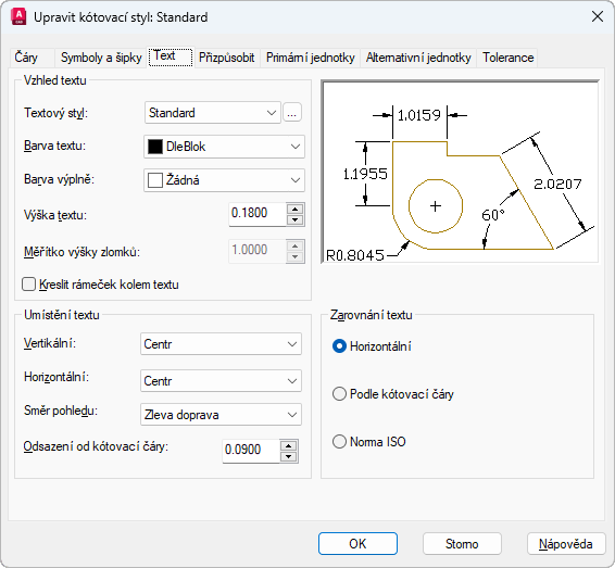 Pokud má styl textu zadaný na této kartě pevnou výšku textu, přepíše tato hodnota výšku textu zadanou zde. Pokud zde chcete nastavit výšku pro text kóty, ujistěte se, že výška stylu textu je nastavena na hodnotu 0. Informace o nastavení výšky textu u stylů textu najdete u příkazu PÍSMO.