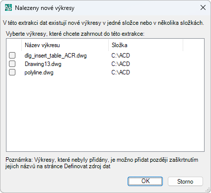 Zobrazuje seznam nových výkresů přidaných do složky, která byla vybrána k extrakci dat po ukončení extrakce.