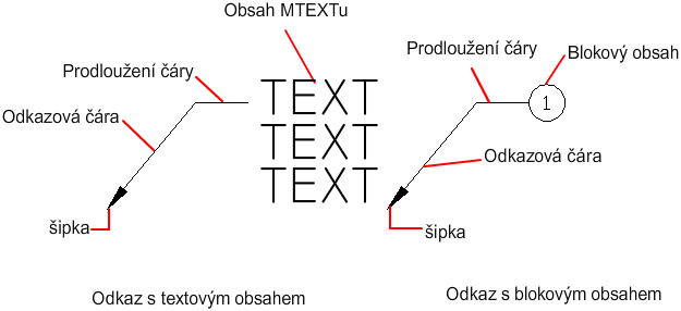 Objekt odkazu je čára nebo spline se šipkou na jednom konci a objektem odstavcového textu na druhém konci.