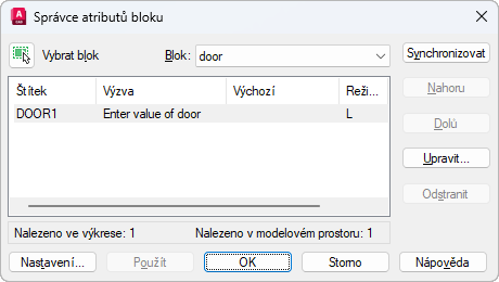 V seznamu atributů se zobrazí atributy vybraného bloku. Implicitně se v seznamu atributů zobrazují vlastnosti atributů: Štítek, Výzva, Výchozí, Režim a Popisný. Popis pod seznamem atributů zobrazuje počet instancí v aktuálním výkresu a v aktuálním rozvržení každého vybraného bloku.