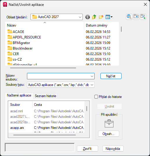 Pokud vyberete soubor, který je již načten, příkaz Načíst v případě nutnosti znovu načte aplikaci. Vypíše momentálně načtené aplikace ObjectARX. V takovém případě je nejprve nutné uvolnit aplikaci ObjectARX a potom ji znovu načíst. Možnost Načíst je také dostupná v místní nabídce po kliknutí pravým tlačítkem myši na soubor na kartě Seznam historie.