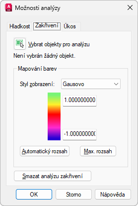 Změní nastavení zobrazení pro analýzu zakřivení objektů těles a povrchů.
