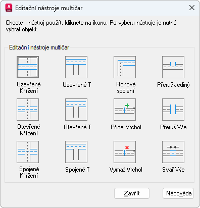 Dialog zobrazí nástroje s ukázkovými obrázky ve čtyřech sloupcích. První sloupec řídí multičáry, které se kříží, druhý multičáry, které tvoří T, třetí rohové spoje a vrcholy a čtvrtý zlomy multičar.