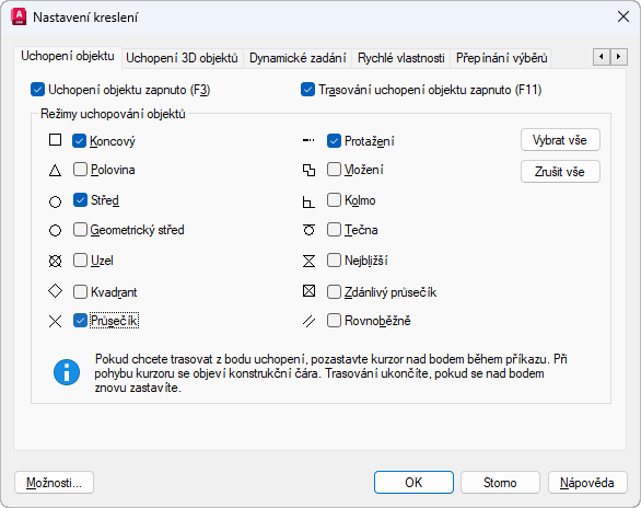 Určuje, zda jsou všechny zadané režimy uchopení objektů zapnuté nebo vypnuté. (systémová proměnná OSMODE)