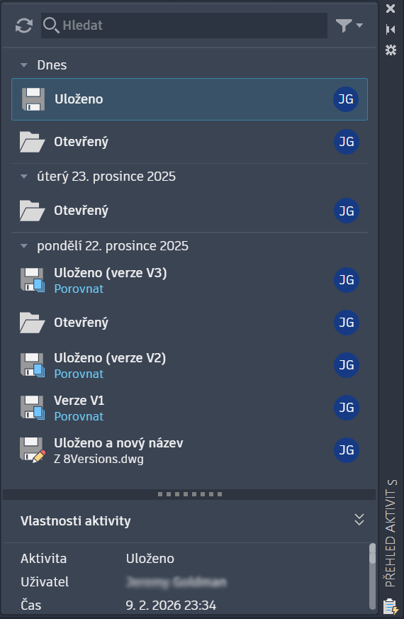 Využijte Přehledy aktivit, pomocí něhož můžete zobrazit příspěvky členů týmu do sdílených výkresových souborů, porovnat historie verzí a spolupracovat skrze produkty AutoCAD.