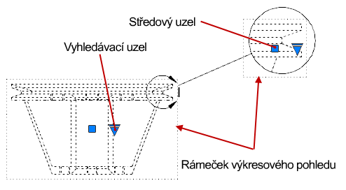 Proč je důležité vědět, kde je rámeček výkresového pohledu? Pokud chcete vybrat výkresový pohled, klikněte na prázdnou oblast uvnitř rámečku výkresu. Podívejte se na detailní pohled na obrázku. Obsahuje kruhový rámeček detailního pohledu, který přesahuje rámeček výkresového pohledu. Pokud kliknete dovnitř rámečku detailního pohledu, nebude výkresový pohled vybrán, pokud se bod, na který jste kliknuli, nenachází uvnitř rámečku výkresového pohledu.