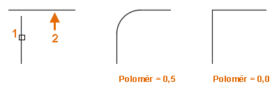 Poznámka: Jestliže je poloměr zaoblení nastaven na hodnotu 0, vybrané objekty budou oříznuty nebo prodlouženy, dokud se nebudou protínat. Oblouk se nevytvoří. Pokud je poloměr zaoblení nastaven na hodnotu 0, můžete odstranit obloukový segment mezi dvěma přímkovými segmenty nebo všechny obloukové segmenty z 2D křivky.