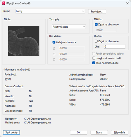 V dialogu Připojit mračno bodů určete předvolby pro bod vložení, měřítko a otočení.
