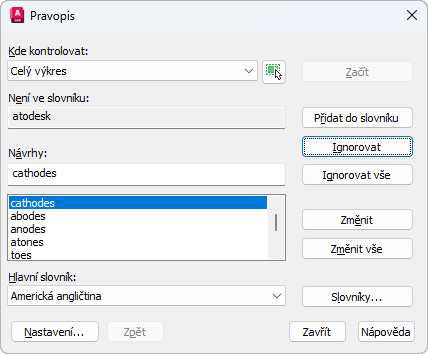 Zkontroluje pravopis jednořádkového textu, víceřádkového textu, textu multiodkazu, textu v atributech bloku, textu v externích referencích a textu přidaného ke kótám.