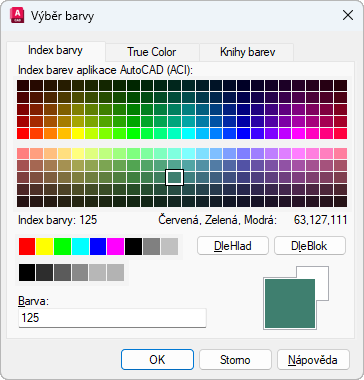 Barvy můžete vybrat z 255 barev indexu barev aplikace AutoCAD (ACI), z barev True Color a z knihy barev, dostupných na třech kartách.