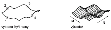 Síť na následujícím obrázku byla odvozena ze čtyř objektů s názvem hrany. Hranami mohou být oblouky, úsečky, křivky, spline a eliptické oblouky, přičemž musí vytvářet uzavřenou smyčku a sdílet koncové body. Záplata kuželové plochy je bikubická plocha (jedna křivka ve směru M a druhá ve směru N) interpolovaná mezi čtyřmi hranami.
