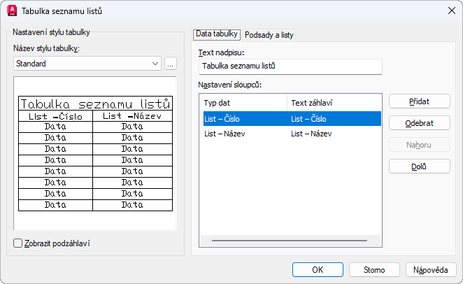 Když je tato volba zapnuta, zobrazí názvy pod-sad a rozdělí tabulku seznamu listů na části.