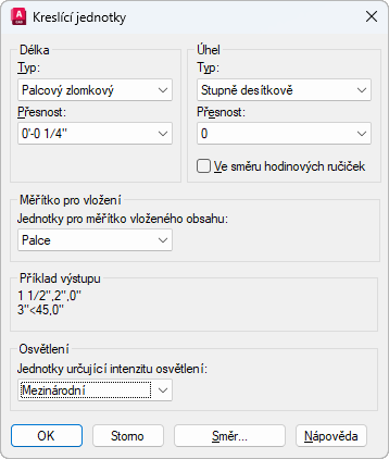 Hodnoty v seznamu jsou Exponenciální, Desítkový, Palcový desetinný, Palcový zlomkový a Zlomkový. Formáty Palcový desetinný a Palcový zlomkový nastavují zobrazení ve stopách a palcích, přičemž se předpokládá, že každá výkresová jednotka odpovídá jednomu palci. Ostatní formáty mohou používat libovolnou reálnou jednotku.