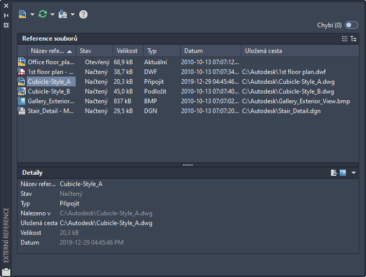 Paleta Externí reference slouží k uspořádání, zobrazení a správě odkazovaných souborů, například souborů DWG (externí referencí), DWF, DWFx, PDF, podložení DGN, rastrových obrázků, mračen bodů (soubory RCP a RCS) a modelů koordinace (soubory NWD a NWC).