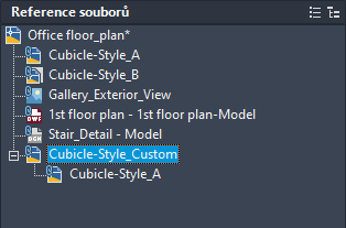 Horní úroveň stromového zobrazení zobrazuje vždy aktuální výkres. Soubory s referencemi se zobrazují na nižší úrovni. Soubory s referencemi, které obsahují vlastní vnořené referenční soubory, lze otevírat tak, aby se zobrazily nižší úrovně. Při provádění výběrů ve stromovém zobrazení nelze současně vybírat více než jeden referenční soubor.