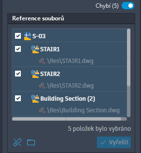 Zobrazí pouze chybějící externí reference (xrefy) v aktuálním výkresu.